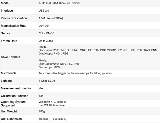 Optical magnification and measurements. Features a 1.3-megapixel sensor that offers improved low light visibility, 20x-90x magninfication rate, up to 30 frames per second, and 8 white LEDs