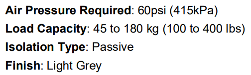 Provide passive vibration isolation for medium-sensitivity microscopy measurements. They consist of a lightweight support base with pneumatic isolators at all four corners. Minimizes coupling between the microscope, table, and floor to prevent vibrations from affecting results