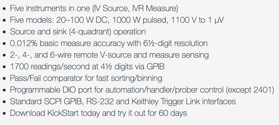 Capable of generating currents and voltages and simultaneously measuring them with high accuracy. Combines a precision direct current (DC) power supply, a power source, a digital multimeter and an electronic load in the same unit. Common applications include current-voltage (I-V) characterization of silicon carbide (SiC) and gallium nitride (GaN) semiconductor circuits, batteries, photovoltaic cells, LEDs, DC-DC converters, power MOSFET circuits, lighting systems, and other non-linear components.