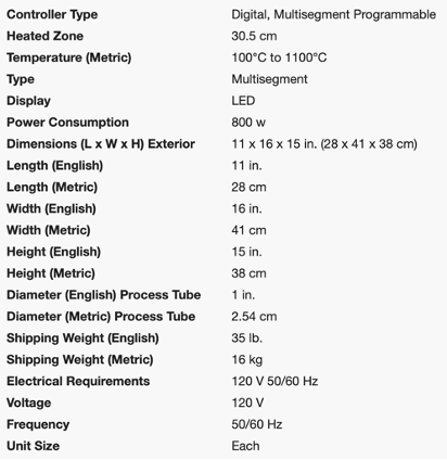 Quickly heat up and/or cool down samples. Operates with the following specifications: Max temperature of 1100°C, 120 Volts, 6.8 Amps, 0.8kWatts, and 50/60 Hz. Typically used to coat, dry, hardening, or purification of samples