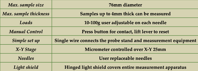 Two main applications. First, a four-point sheet resistance measurement of a thin layer or substrate which is used in nanofabrication to measure the resistive properties of conducting films. Second, a three-point spreading resistance measurements to analyze resistivity versus depth in semiconductors. The tool is used primarily for determining doping structures in silicon semiconductors